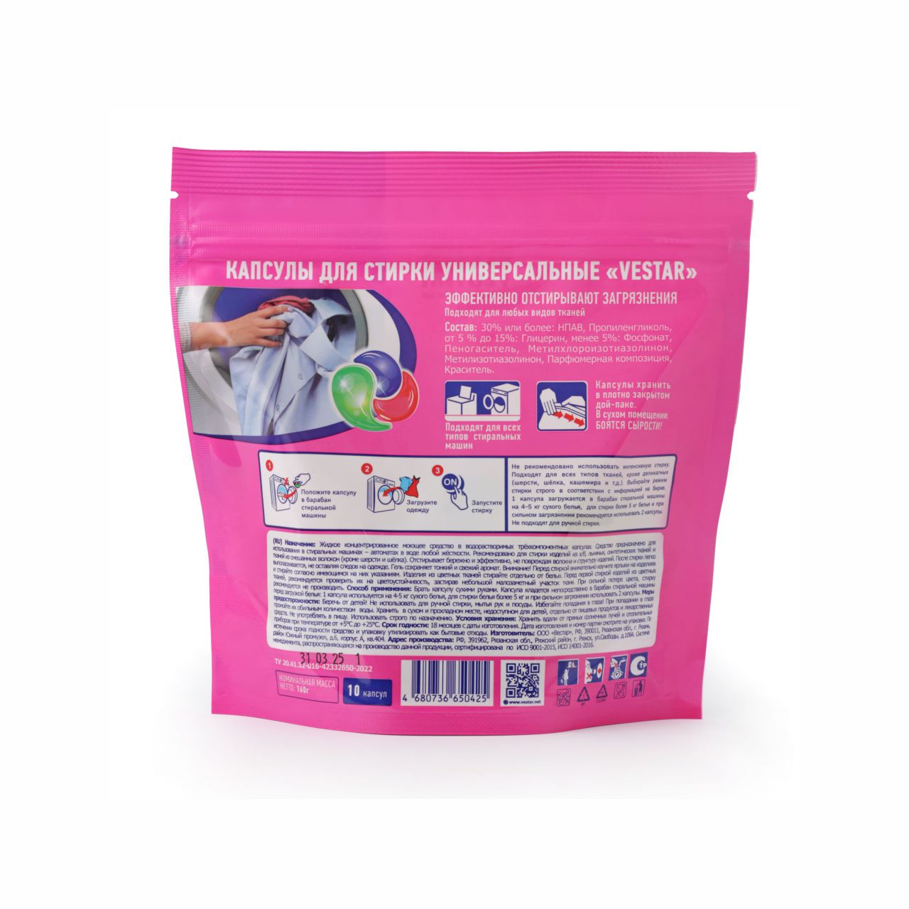 Жидкое концентрированное моющее средство в водорастворимых трёхкомпонентных капсулах. Средство предназначено для использования в стиральных машинах- автоматах в воде любой жёсткости. Рекомендованно для стирки изделий из х/б, льняных, синтетических тканей и тканей из смешанных волокон (кроме шерсти и шёлка). Отстирывает бережно и эффективно, не повреждая волокна и структуру изделий. После стирки легко выполаскивается, не оставляя следов на одежде. Гель сохраняет тонкий и свежий аромат. Внимание! Перед стиркой внимательно изучите ярлыки на изделиях и стирайте согласно имеющимся на них указаниям. Изделия из цветных тканей стирайте отдельно от белых. Перед первой стиркой изделий из цветных тканей, рекомендуется проверить их на цветоустойчивость, застирав небольшой малозаметный участок ткани. При сильной потере цвета, стирку рекомендуется не производить.